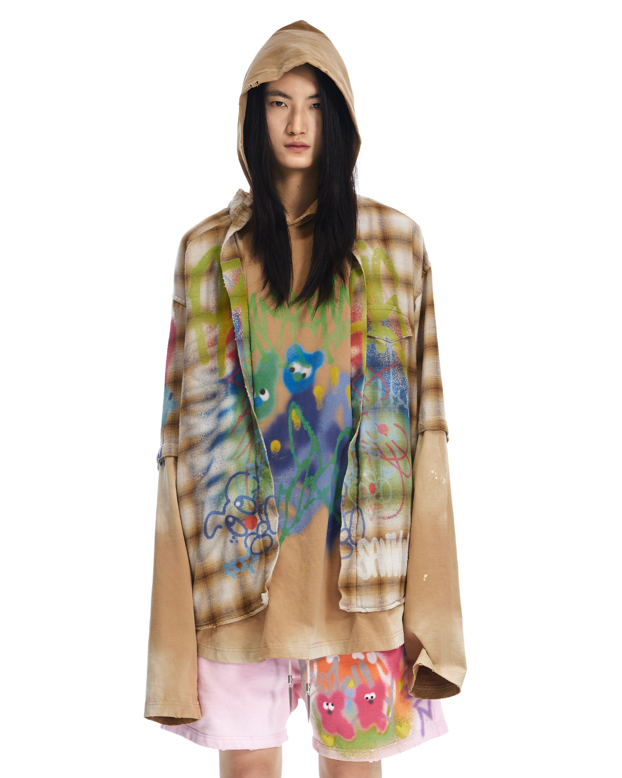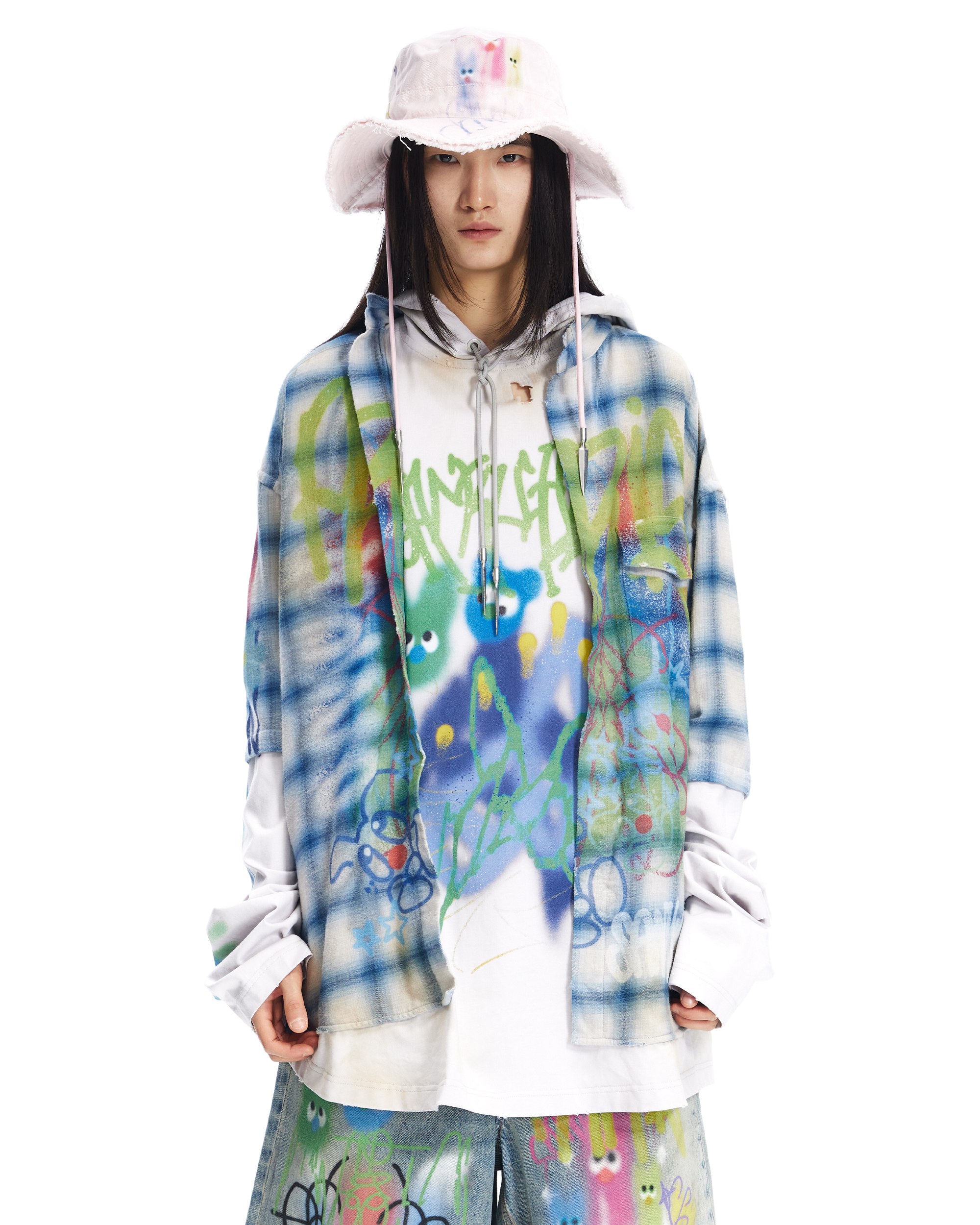 • BUMPY GRAFFITI PRINT LAYERED PLAID HOODED SWEATSHIRT
