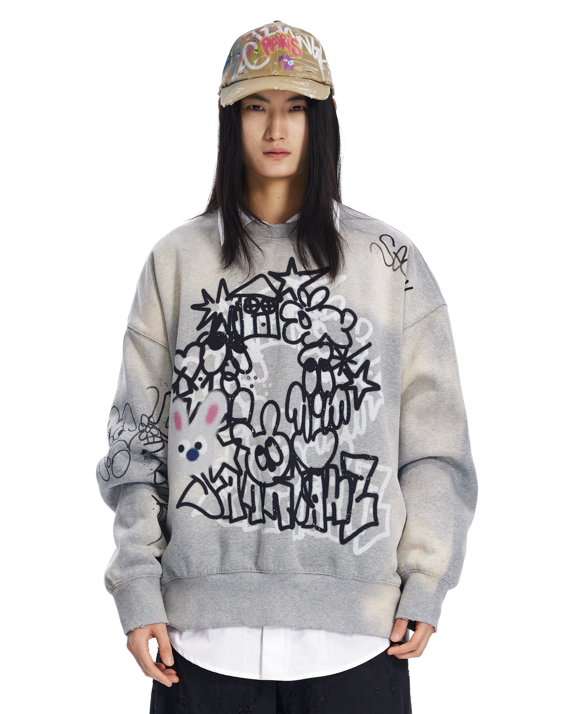 • BUMPY GRAFFITI PRINT DOUBLE HEM CREWNECK SWEATSHIRT
