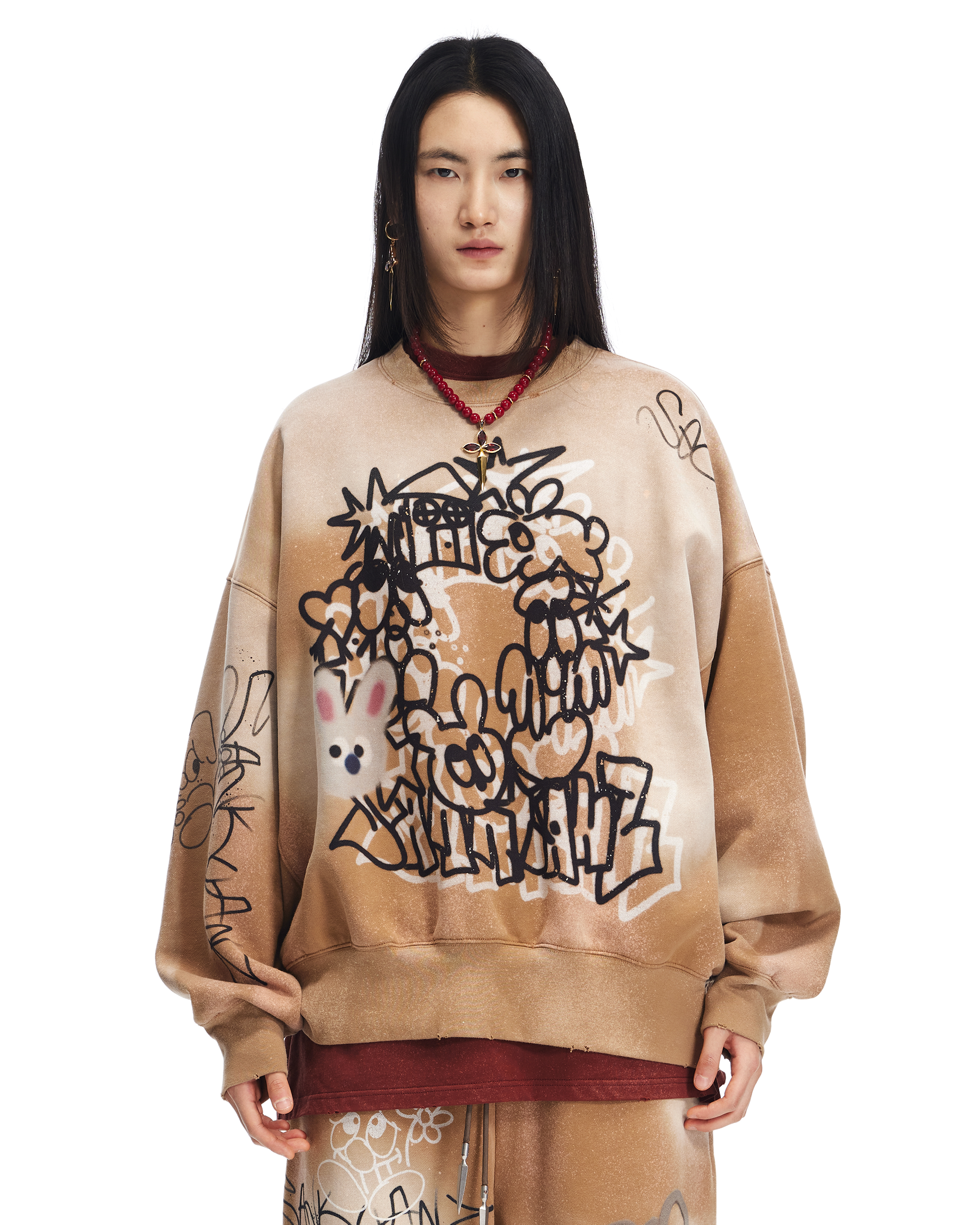 • BUMPY GRAFFITI PRINT BLEACHED CREWNECK SWEATSHIRT