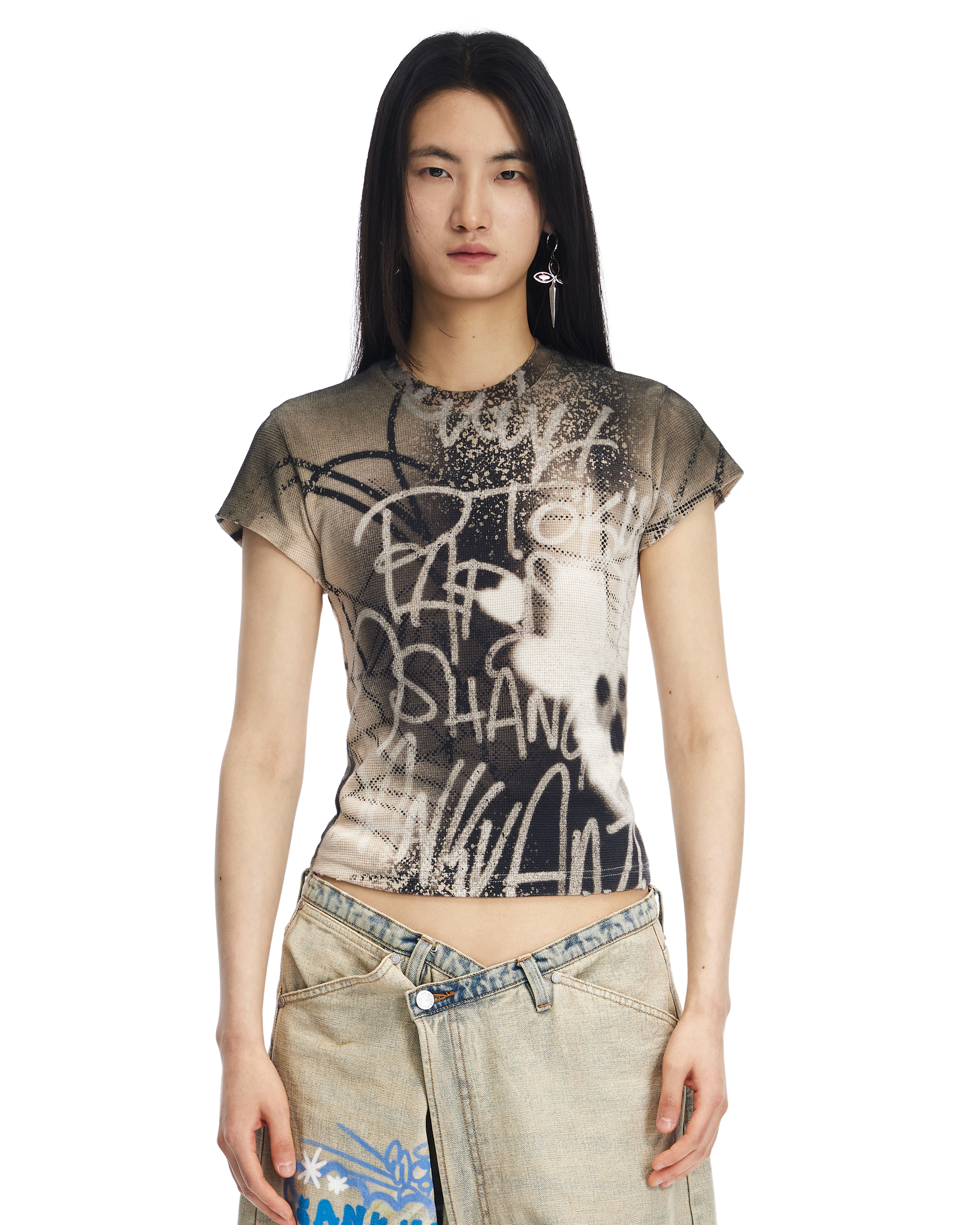 BUMPY SOLID GRAFFITI PRINT FITTED T-SHIRT